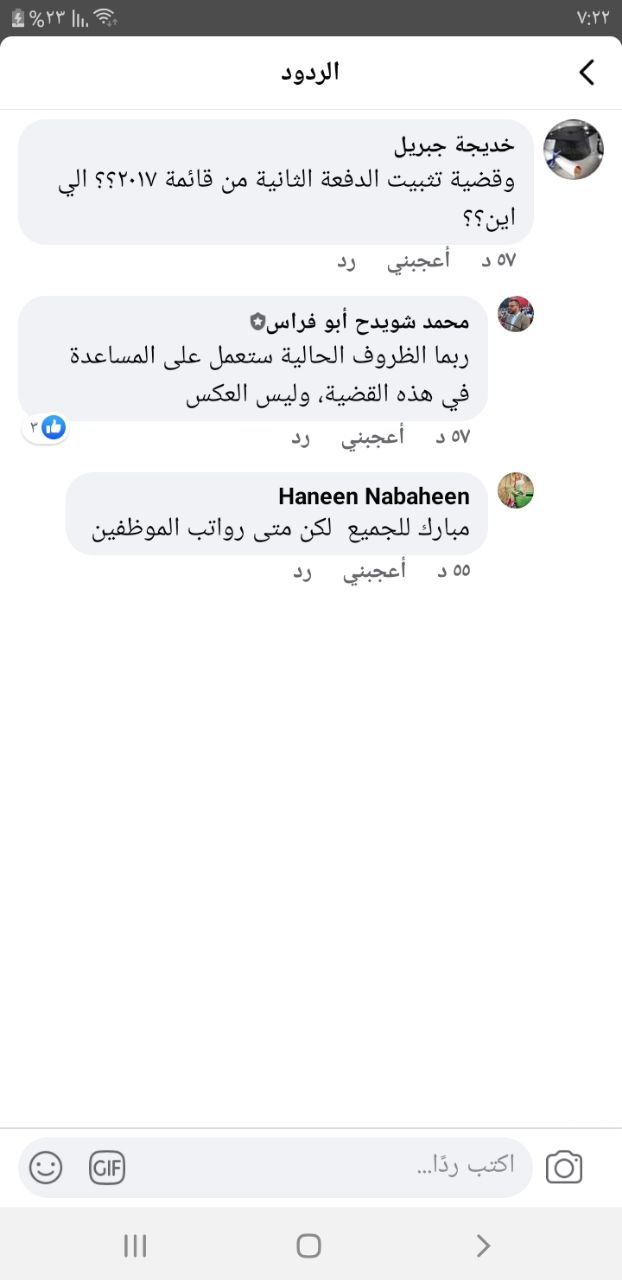 اننا نقف الي جانب مطالب هؤلاء الموظفين بعودتهم الي وظائفهم التي فصلوا منها كحق طبيعي لهم ، وفي ذات الشأن ندعو الي تلبية مطالب الاخوه موظفي الشواغر بتثبيتهم اسوه بزملائهم حيث انهم ينتظرون التثبيت منذ ديسمبر ٢٠١٧ وفقا لما تم الوعد به من مدير عمليات الوكاله في قطاع غزه