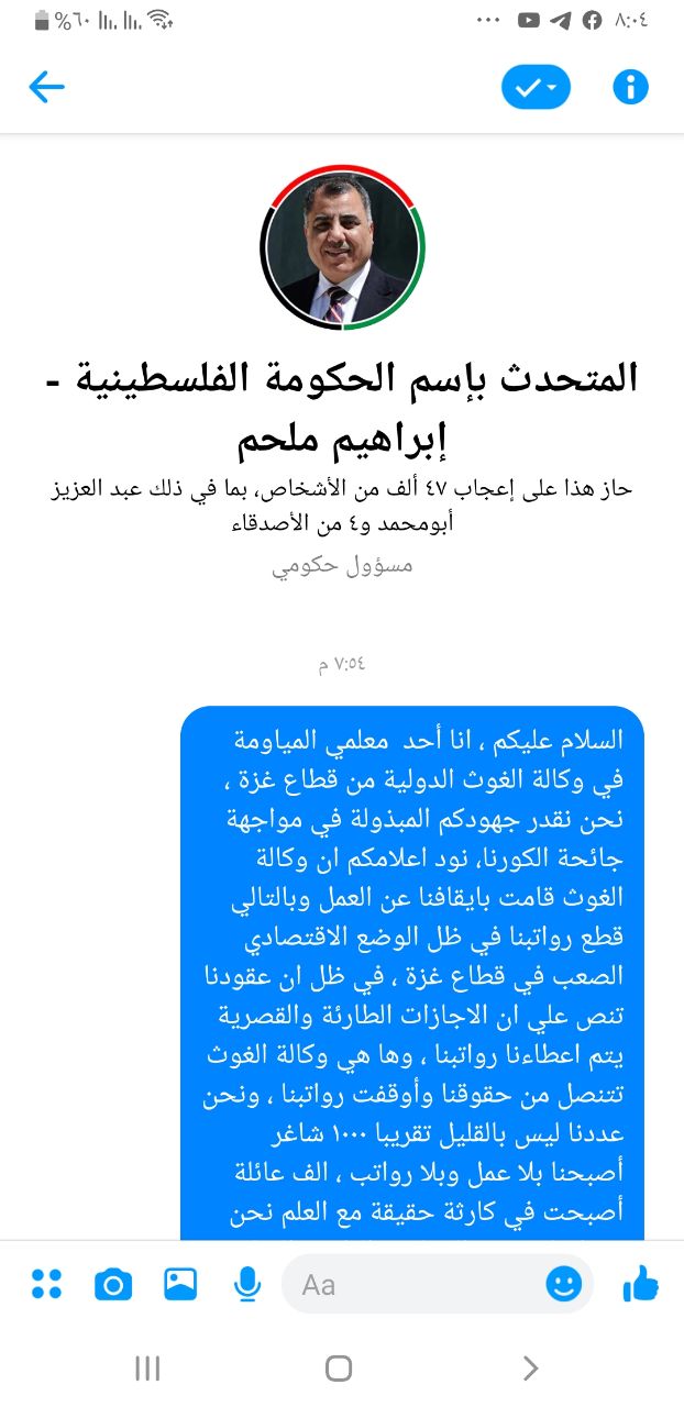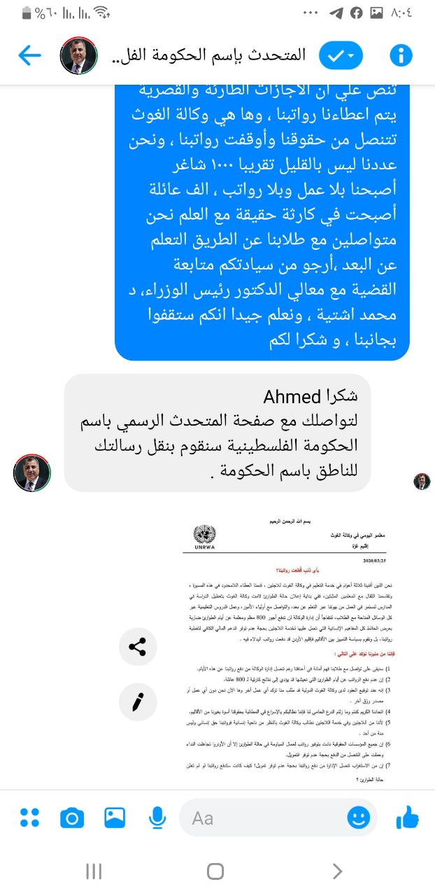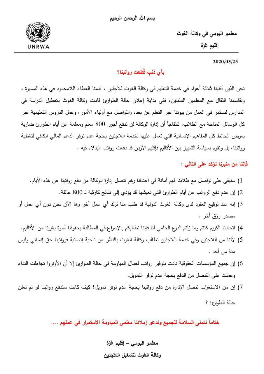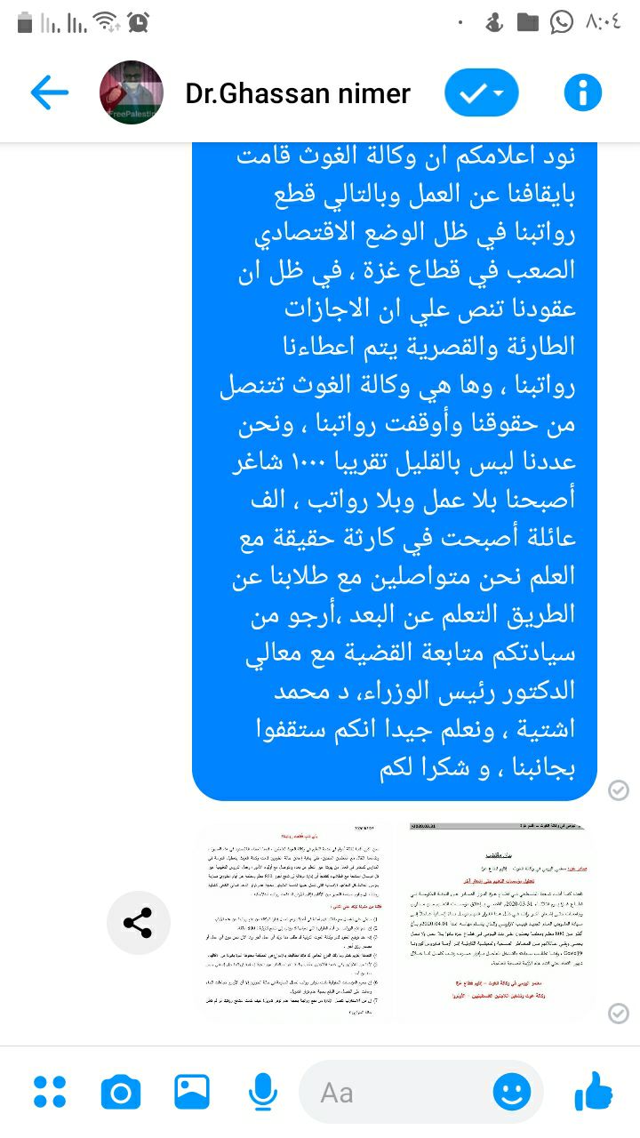 السلام عليكم ، انا أحد معلمي المياومة في وكالة الغوث الدولية من قطاع غزة ، نحن نقدر جهودكم المبذولة في مواجهة جائحة الكورنا، نود اعلامكم ان وكالة الغوث قامت بايقافنا عن العمل وبالتالي قطع رواتبنا في ظل الوضع الاقتصادي الصعب في قطاع غزة ، في ظل ان عقودنا تنص علي ان الاجازات الطارئة والقصرية يتم اعطاءنا رواتبنا ، وها هي وكالة الغوث تتنصل من حقوقنا وأوقفت رواتبنا ، ونحن عددنا ليس بالقليل تقريبا ١٠٠٠ شاغر أصبحنا بلا عمل وبلا رواتب ، الف عائلة أصبحت في كارثة حقيقة مع العلم نحن متواصلين مع طلابنا عن الطريق التعلم عن البعد ،أرجو من سيادتكم متابعة القضية مع معالي الدكتور رئيس الوزراء، د محمد اشتية ، ونعلم جيدا انكم ستقفوا بجانبنا ، و شكرا لكم