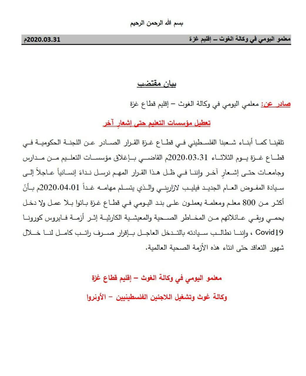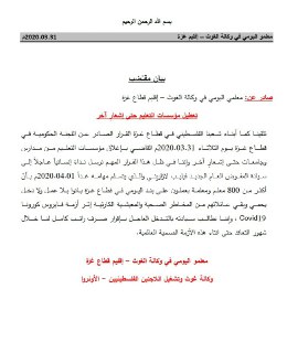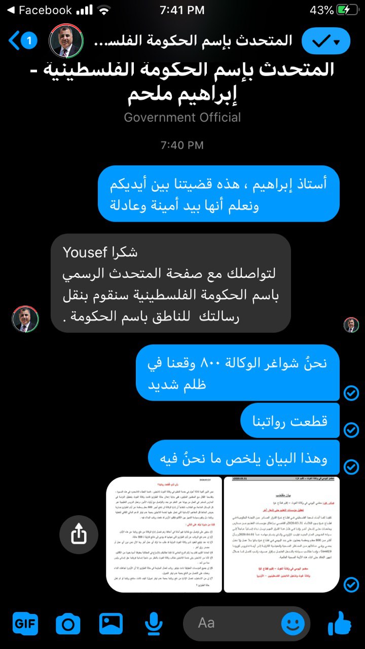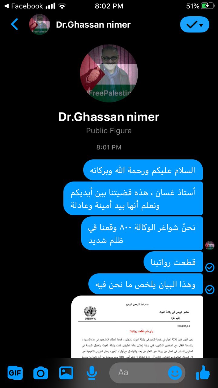 السلام عليكم ، انا أحد معلمي المياومة في وكالة الغوث الدولية من قطاع غزة ، نحن نقدر جهودكم المبذولة في مواجهة جائحة الكورنا، نود اعلامكم ان وكالة الغوث قامت بايقافنا عن العمل وبالتالي قطع رواتبنا في ظل الوضع الاقتصادي الصعب في قطاع غزة ، في ظل ان عقودنا تنص علي ان الاجازات الطارئة والقصرية يتم اعطاءنا رواتبنا ، وها هي وكالة الغوث تتنصل من حقوقنا وأوقفت رواتبنا ، ونحن عددنا ليس بالقليل تقريبا ١٠٠٠ شاغر أصبحنا بلا عمل وبلا رواتب ، الف عائلة أصبحت في كارثة حقيقة مع العلم نحن متواصلين مع طلابنا عن الطريق التعلم عن البعد ،أرجو من سيادتكم متابعة القضية مع معالي الدكتور رئيس الوزراء، د محمد اشتية ، ونعلم جيدا انكم ستقفوا بجانبنا ، و شكرا لكم