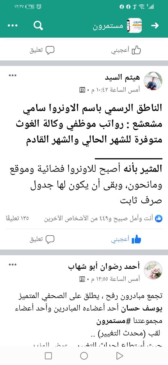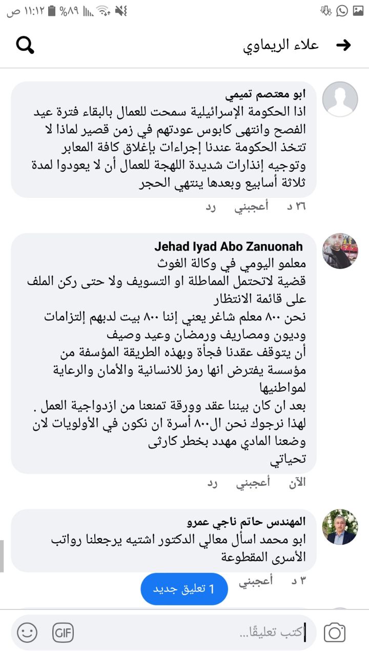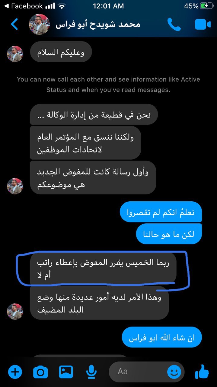 وخبرني انهم اليوم رح يرفعوا الأمر للدكتور محمد اشتية ورح ينتظروا رد الاونروا على هذا الاجراء وبعدها يعلنوا بمؤتمر تبعات الرد