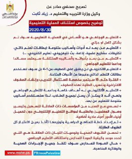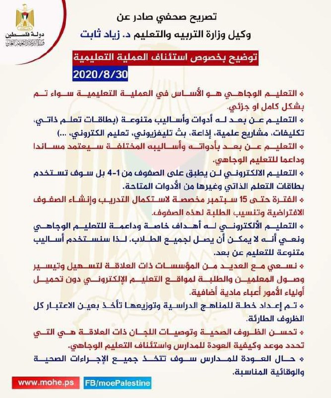 وكيل وزارة التربية والتعليم في قطاع غزة زياد ثابت:حتى منتصف سبتمر القادم ستتضح الأمور فيما يخص العملية التعليمة في قطاع غزة".
