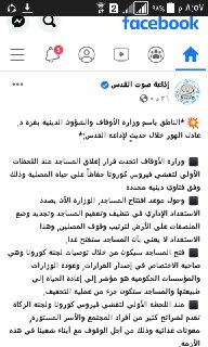 فتح المساجد مطلع الأسبوع القادم وفق إجراءات السلامة والوقاية في رفح وخانيونس والوسطى. -