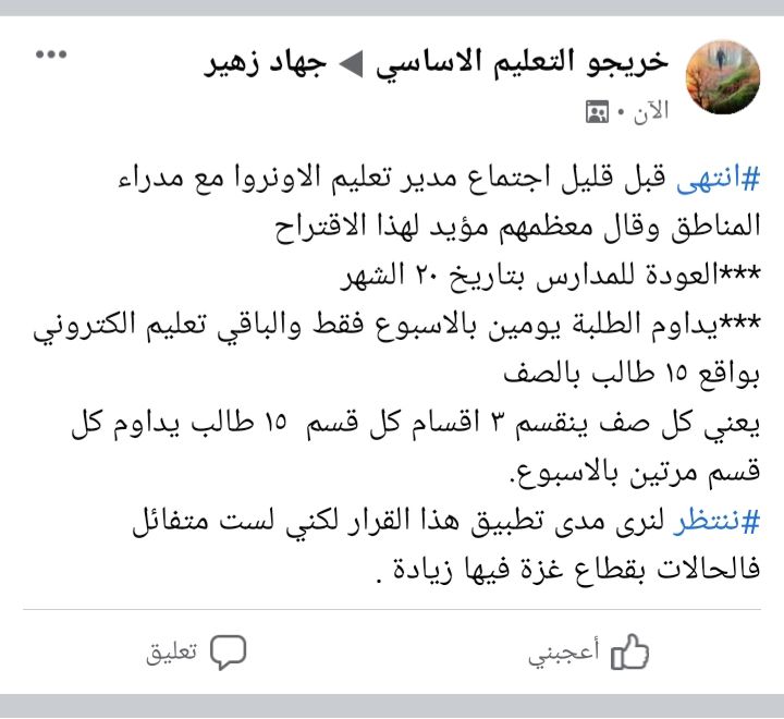 بديش احبطك بس الوكالة اخر واحدة رح تفتح المدارس لانها مش مستعدة تتحمل اي مسؤولية