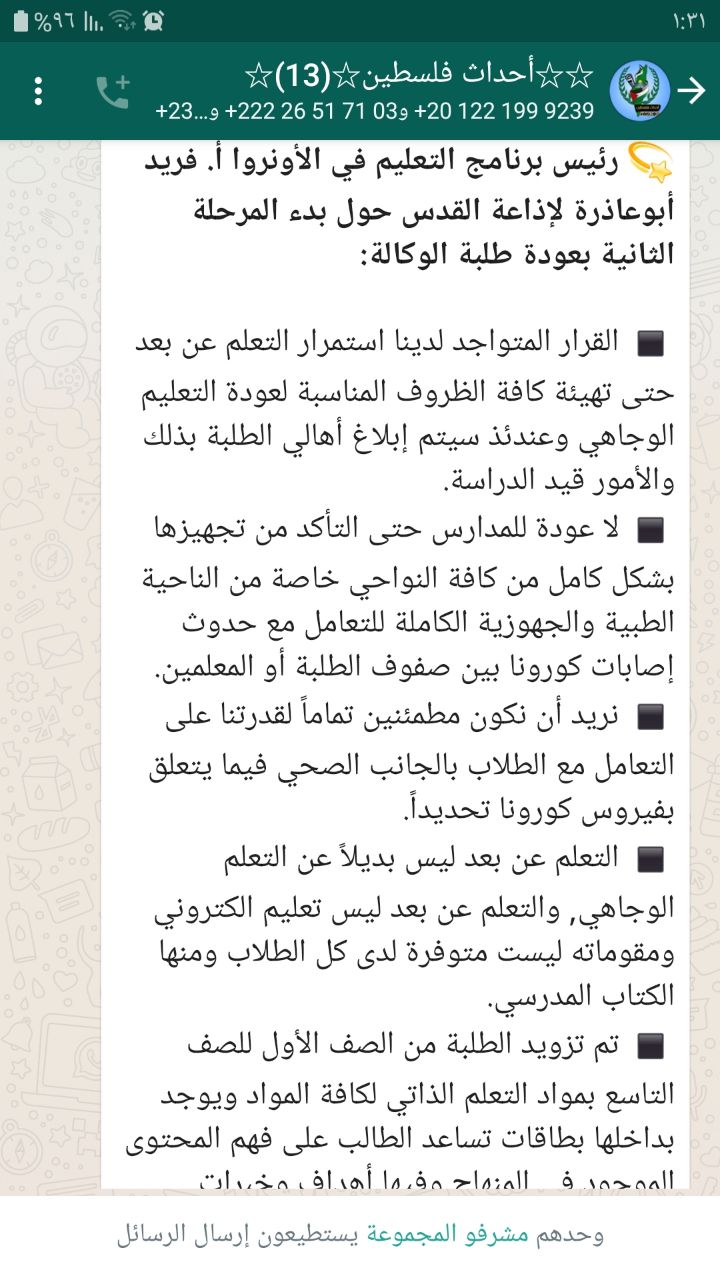 فريد ابو عاذرة.. لا قرار لحتى الان لدى الوكالة بالعودة للمدارس. والالتزام بالدراسة عن بعد