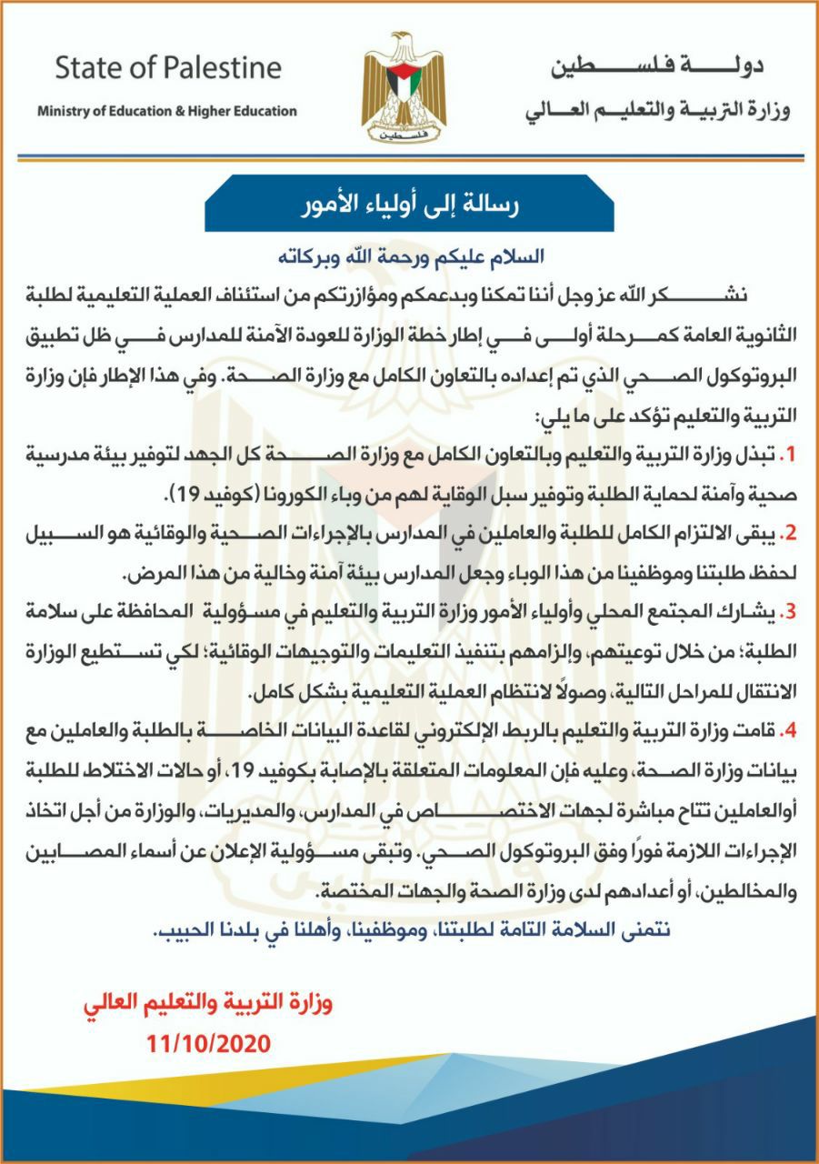 تعلن وزارة التربية والتعليم العالي _ مديرية التربية والتعليم رفح، عن عودة دوام المعلمين للصفوف من السابع حتى الحادي عشر يوم السبت القادم 17 / 10 / 2020، ودوام طلبة الصف العاشر والحادي عشر فقط يوم الاثنين القادم 19 / 10 / 2020، ودوام طلبة الصف السابع والثامن والتاسع ليس الآن ويحدد في وقتٍ لاحق .