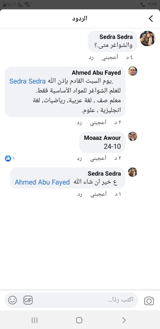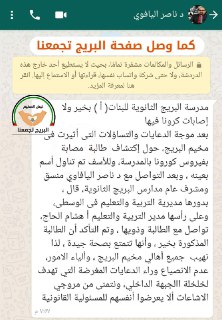 انني ومن خلال متابعتي لسير الامور بالمدارس مع مديرية التربية والتعليم والمجلس الأعلى لأولياء الأمور بمديرية التربية والتعليم شرق غزة ابشر كل اولياء الامور بأن الوضع جيد وكان ذلك بفضل الله اولا وفضل وجهود مديرية التربية والتعليم شرق غزة التي عملت على مدار الساعة كخلية نحل مع مدراء ومديرات المدارس ومع المعلمين والمعلمات والمجلس الأعلى لأولياء الأمور بمديرية التربية والتعليم شرق غزة والمجتمع المحلي وكانت ثمرة الجهود مثمرة وبشائر خير لمواصلة تطبيق الخطوة الثانية والثالثة وكل الشكر والتقدير لمديرية التربية والتعليم شرق غزة والمدراء والمديرات ومعلمين ومعلمات وكل من شارك .