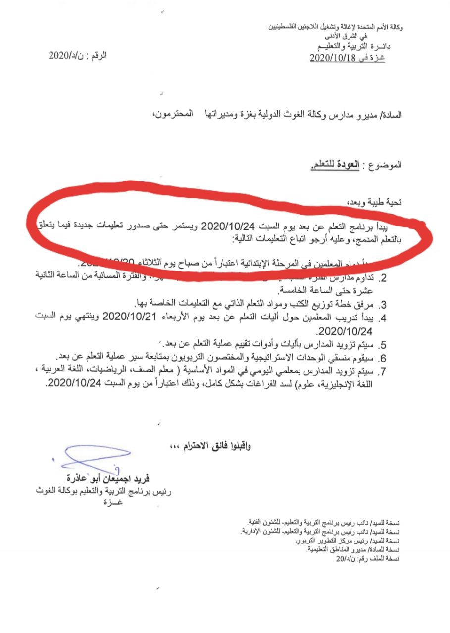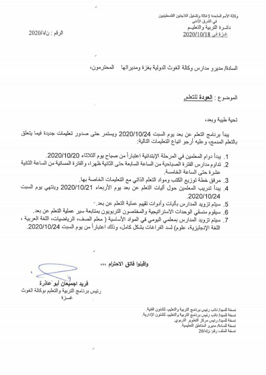 #الأونروا بغزة: يبدأ برنامج التعليم عن بعد يوم السبت 2020/10/24 ويستمر حتى صدور تعليمات جديدة فيما يتعلق بالتعليم المدمج.