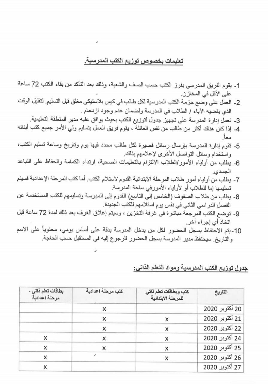 ستبدأ الأونروا ابتداءً من يوم الثلاثاء الموافق 20 أكتوبر بتوزيع الكتب المدرسية داخل مدارسها مع إعطاء مواعيد مسبقة باستخدام نظام مماثل للنظام المُتبع في توزيع المساعدات الغذائية. وسيتم إبلاغ من سيحضر لاستلام الكتب المدرسية بضرورة ارتداء الكمامة والحضور بشكل منفرد في حال عدم ظهور أعراض الفايروس عليه\ها.