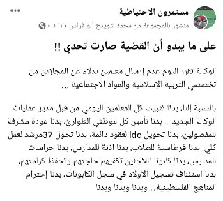 الوكالة تقرر اليوم عدم إرسال معلمين بدلاء عن المجازين من تخصصي التربية الإسلامية والمواد الاجتماعية ... -