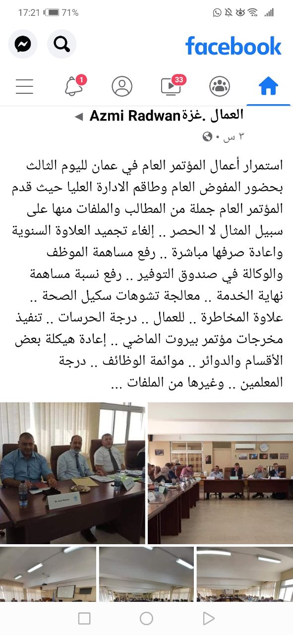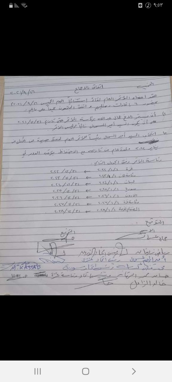▪️فوجئنا بالأمس وبعد انتهاء اليوم الأول التحضيري للمؤتمر ، وبعد مغادرة رئيس اتحاد الضفة الغربية ورئيس اتحاد إقليم الأردن وغياب اتحاد إقليم لبنان بإرسال رسالة الساعة السابعة مساء إلى إدارة الوكالة من قبل عدد من أعضاء من المؤتمر وعددهم 7 بينما عدد مجموع المشاركين كأعضاء المؤتمر 19 ، بتعيين رئيس جديد للمؤتمر بعد حصولهم على تزكية الإدارة ومن ثم الاستقواء. فوافقت الإدارة بعد عشر دقائق على ما تم إرساله