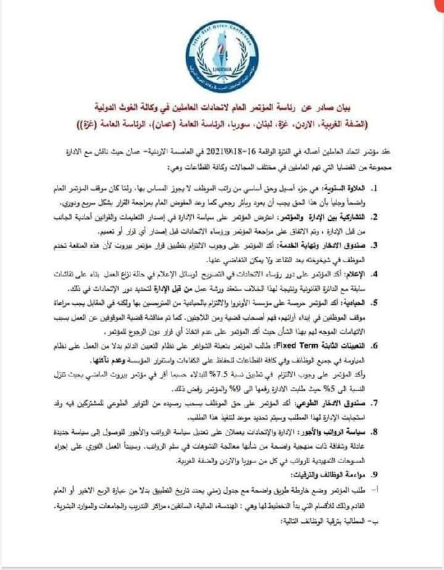 لا يتجاوز 150 موظفا، وهما اتحادان لا وجود لهم ذكر في الدستور ووجدوا بقرار من إدارة الوكالة . إضافة الى اتحاد غزة وعضو من سوريا يعد ضربة للمؤتمر وتدميرا لكل الجهود التي بذلت لعقد هذا المؤتمر وان ما جرى استباقة كان بهدف بعثرة الاوراق ووقف تعديل الدستور الذي لو تم لما وجدنا اتحاد لرئاسة عمان ورئاسة غزة على خارطة الاتحادات