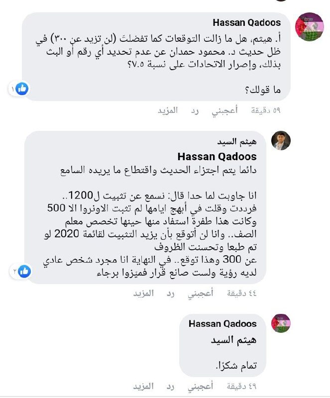 عندنا استاذ ممثل عن الاتحاد قال مطالبنا التثبيت ع نسبة ٧ ونص وع هاي النسبة عدد المثبتين حيكون ٩٠٠ وسألت بأسوأ الظروف ممكن كم يثبتوا قال ٧٠٠ او ٦٠٠ لكن مطالب الاتحاد ٩٠٠ ع نسبة ٧ونص.