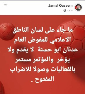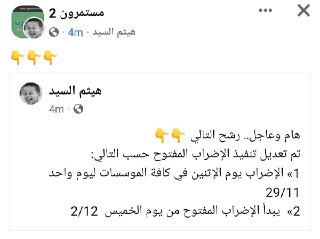 ما يتم تداوله على صفحات الفيس عن موعد الاضراب المفتوح غير دقيق وما زالت اجتماعات المؤتمر العام مستمرة وسيكون بيان بعد انتهاء الاجتماعات -