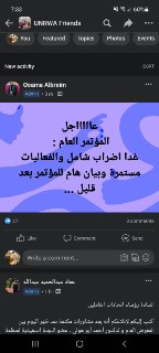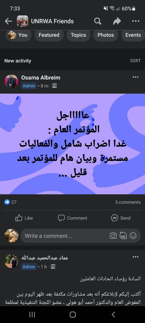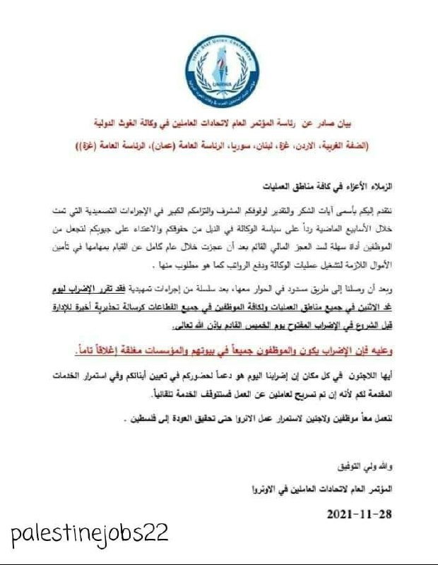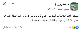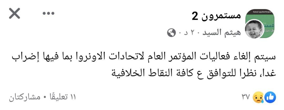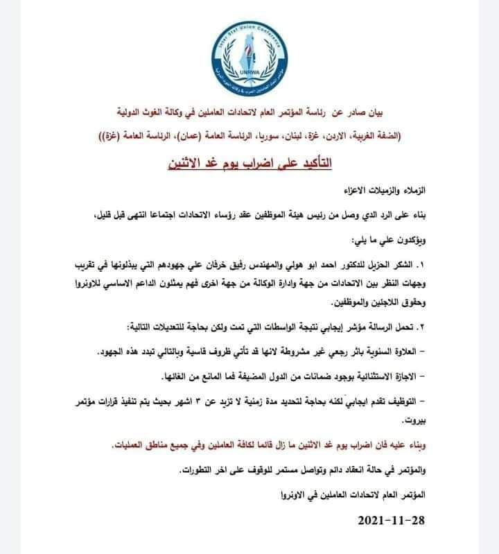 سيتم إلغاء فعاليات المؤتمر العام لاتحادات الاونروا بما فيها إضراب غدا، نظرا للتوافق ع كافة النقاط الخلافية