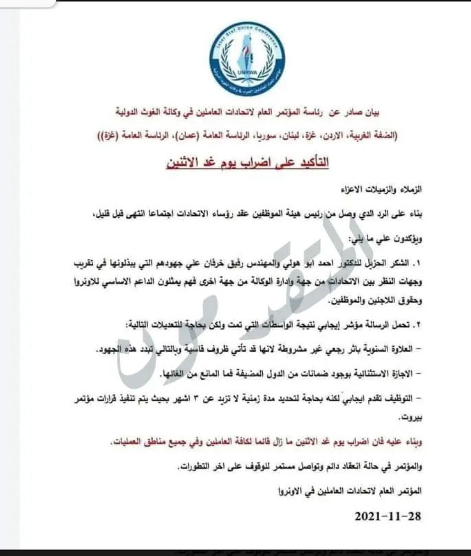 وبناء عليه فان المؤتمر العام قرر تعليق الاضراب المفتوح يوم الخميس القادم على ان يبقى نزاع العمل بين الادارة والاتحادات قائما ومستمرا لحين تطبيق ماجاء في هذه الاتفاقية -