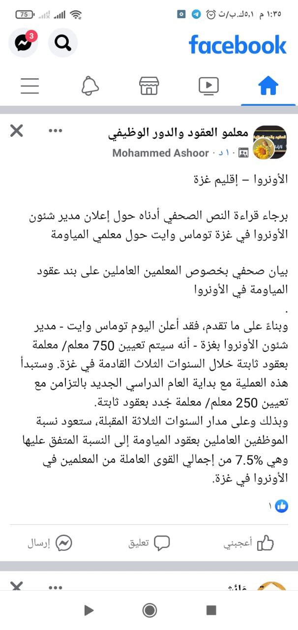 [٢٢/٢ ٢:٣٣ م] Mrs. Kefa7: *قد أعلن اليوم توماس وايت - مدير شئون الأونروا بغزة - أنه سيتم تعيين 750 معلم/ معلمة بعقود ثابتة خلال السنوات الثلاث القادمة في غزة. وستبدأ هذه العملية مع بداية العام الدراسي الجديد بالتزامن مع تعيين 250 معلم/ معلمة جُدد بعقود ثابتة.*