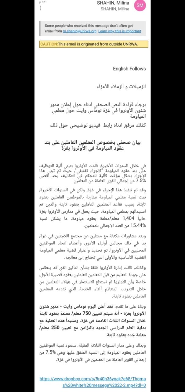 وبناءً على ما تقدم، فقد أعلن اليوم توماس وايت - مدير شئون الأونروا بغزة - أنه سيتم تعيين 750 معلم/ معلمة بعقود ثابتة خلال السنوات الثلاث القادمة في غزة. وستبدأ هذه العملية مع بداية العام الدراسي الجديد بالتزامن مع تعيين 250 معل م/ معلمة جُدد بعقود ثابتة.