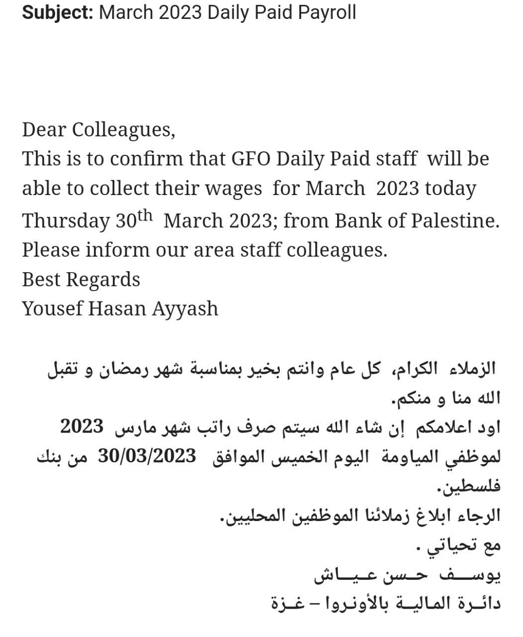 اود اعلامكم إن شاء الله سيتم صرف راتب شهر مارس 2023 لموظفي المياومة اليوم الخميس الموافق 30/03/2023 من بنك فلسطين .