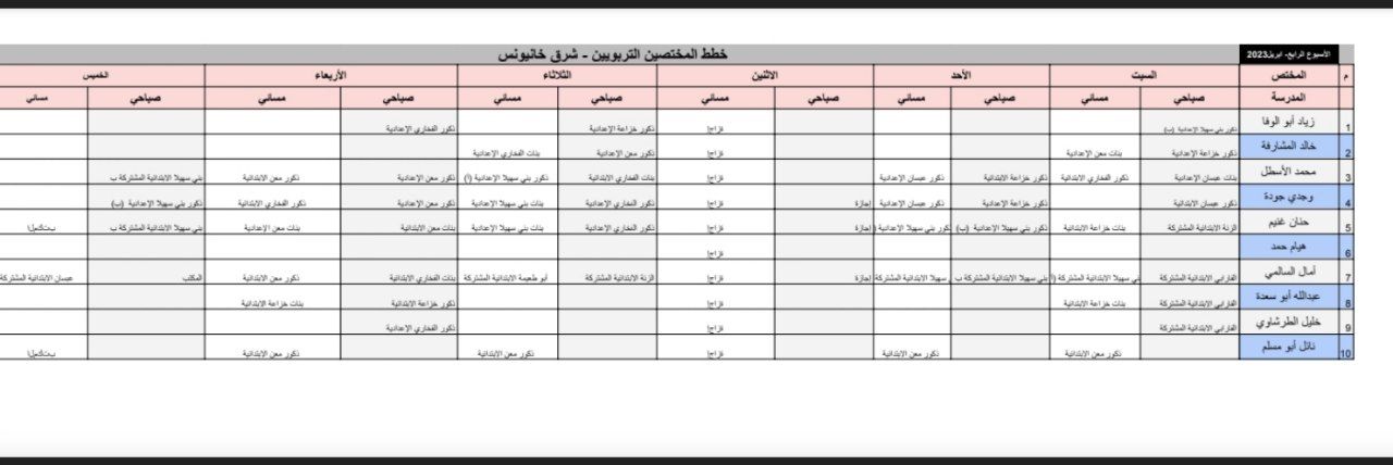 جدول غرب خانيونس الخاص بالمشرفين
