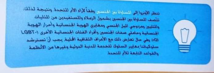 ثالثا // يرد لاكثر من مره وفي صفحه 17 مثال احترام الانواع الاجتماعيه - بصيغة الجمع - وكذلك ورد لاكثر من مره جمله الميل او الميول الجنسيه صفحة 23 مثال باكثر من صيغه وشكل ، وهذا من شانه خلط المفاهيم وتوجيهها نحو تقبل اوضاع غير مقبوله ضمن عادات وتقاليد وثقافه الشعب الذي وجدت من اجله الاونروا على خلاف ما ورد في الاعلان العالمي لحقوق الانسان وفي كافه المواثيق الدوليه التي نصت على احترام الدين وعادات وتقاليد الشعوب .