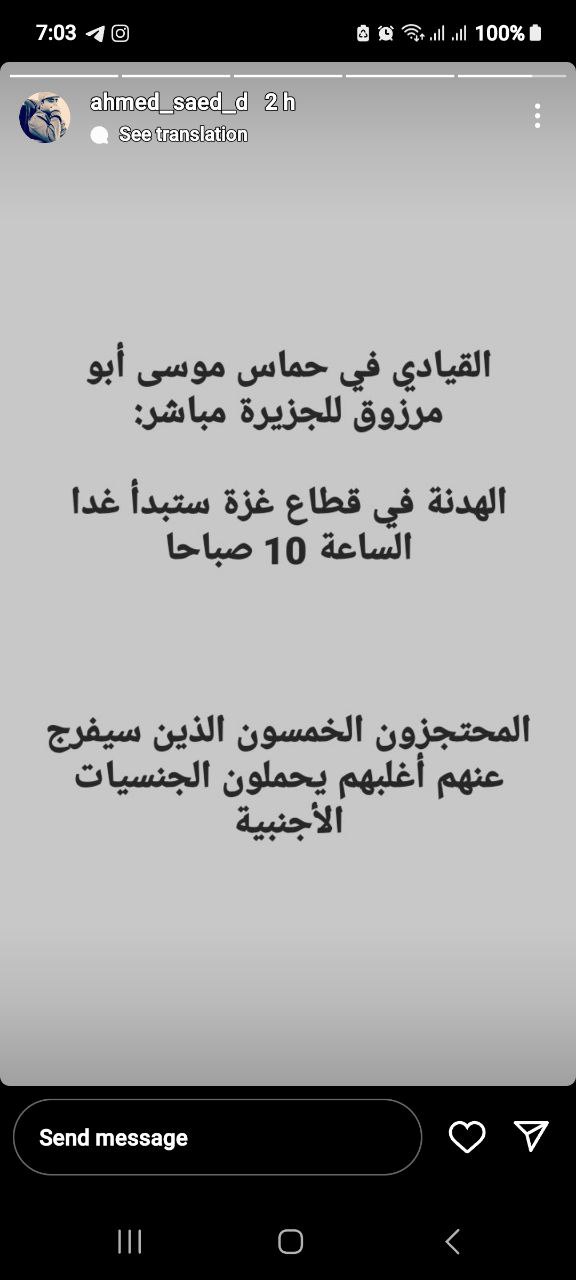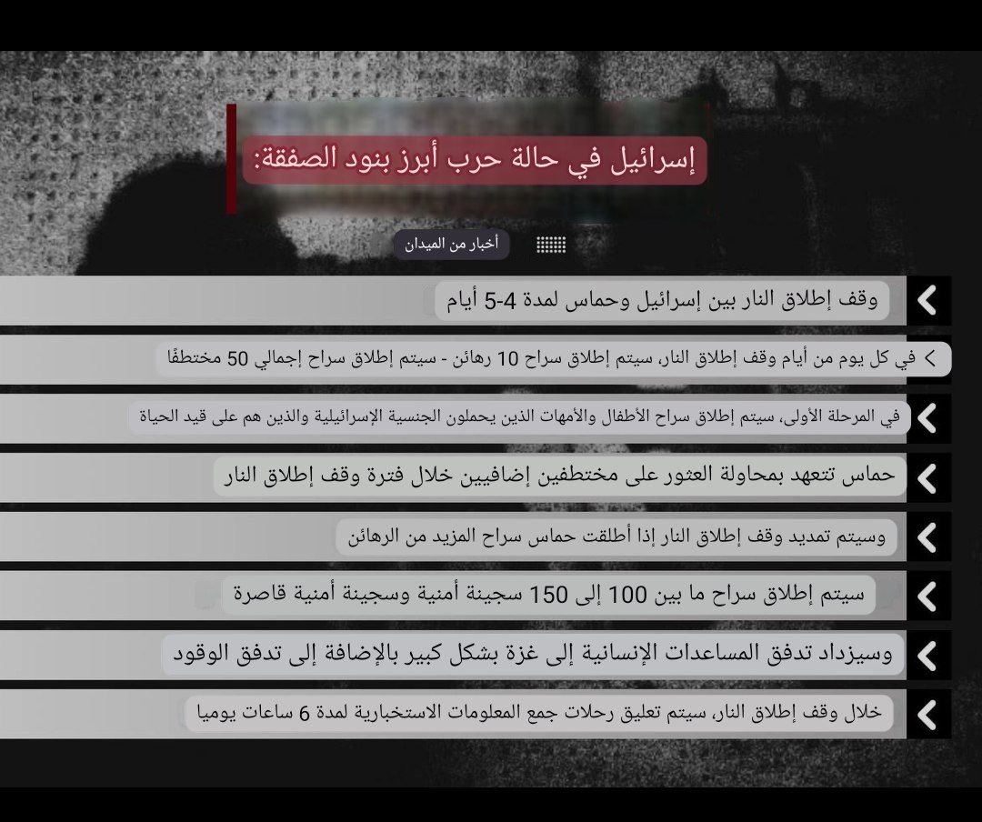 *الإعلام العبري: ستدخل التهدئة المؤقتة حيز التنفيذ ظهر الخميس، حيث سيتم بموجب الخطة إطلاق سراح أول المختطفين..*