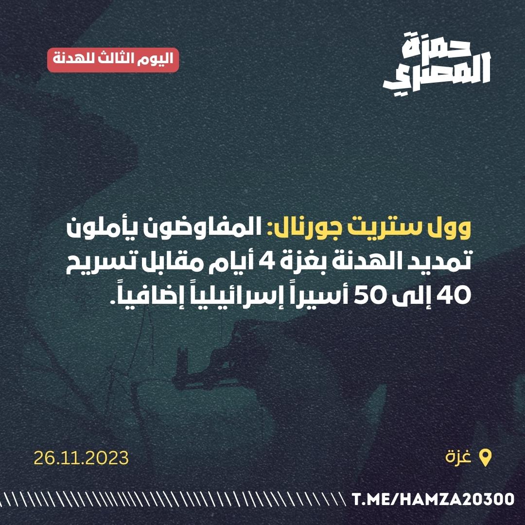 ▪️سيتم الاعلان عن توقيت بدء الهدنة الإنسانية خلال 24 ساعة وتستمر لأربعة أيام قابلة للتمديد