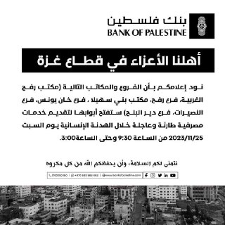 1. سيتم صرف سلفة من البنوك لموظفي القطاع العام والمتقاعدين بنسبة 50% من الراتب وبحد أدناه 1800 شيكل، وذلك يوم الأربعاء الموافق 2023/11/29.