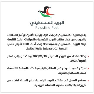 البريد الفلسطيني يعلن عن بدء صرف رواتب الأسرى وأسر الشهداء والجرحى من خلال مكاتب البريد الرئيسية والصرافات الآلية التابعة لبنك البريد الفلسطيني بنسبة 50% وبحد أدنى 1800 شيكل، ابتداء من اليوم الخميس 30/11/2023 وذلك عن راتب شهر أكتوبر/ 2023..
