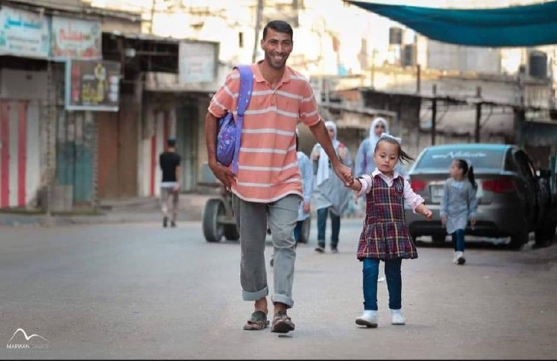 استشهاد صاحب هذه الصورة الشهيرة أثناء إيصال طفلته للمدرسة في بداية العام الدراسي.. الشاب أبو صالح حماد جراء القصف الصهيوني على مخيم المغازي وسط قطاع غزة.