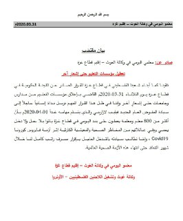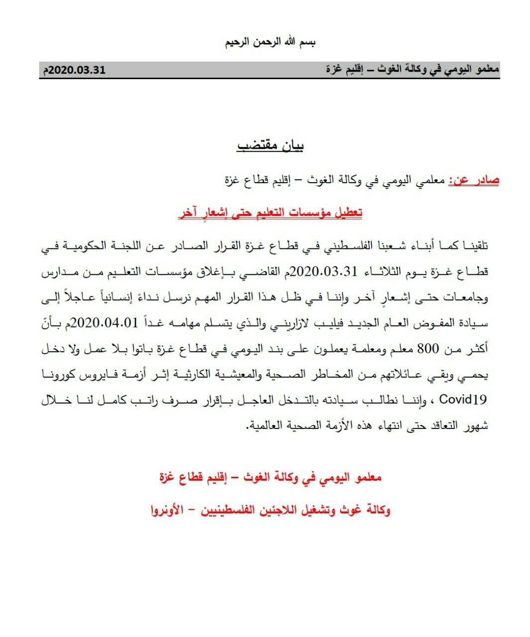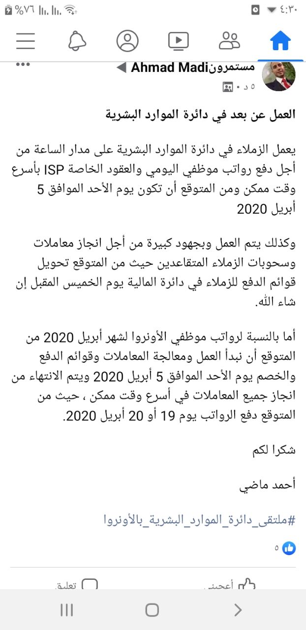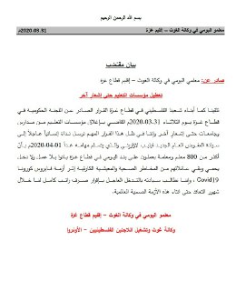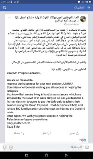 يطيب لنا ويسعدنا أن نتقدم من السيد/ فيليب لازاريني بخالص التهاني بمناسبة تعيينكم مفوضاً عاماً لوكالة الغوث وتشغيل اللاجئين الفلسطينيين متمنين لشخصكم الكريم التوفيق والنجاح في القيـام بالمهام المسندة إليكم، وهذا شيء مؤكد؛ لخبرتكم الواسعة في مجال العمل الإنساني، وفي الوقت الذي تسمو فيه معاني الإنسانية والحرص على استمرار الحياة في كل العالم، فإننا نتطلع من سيادتكم لقرار إنساني بالموافقة على صرف رواتب العاملين على بند اليومي طوال فترة أزمة كورونا الطارئة؛ لإعانتهم وإغاثة أكثر من 800 أسرة من الأخطار الصحية والمعيشية المحدقة بهم نتيجة أزمة كورونا.