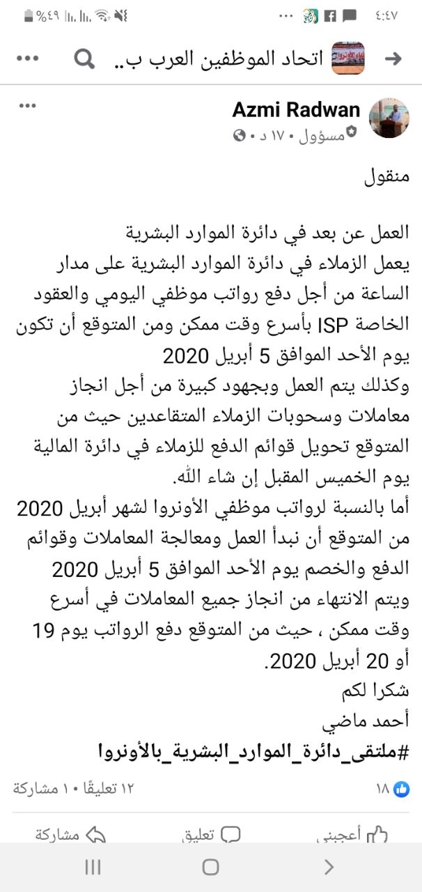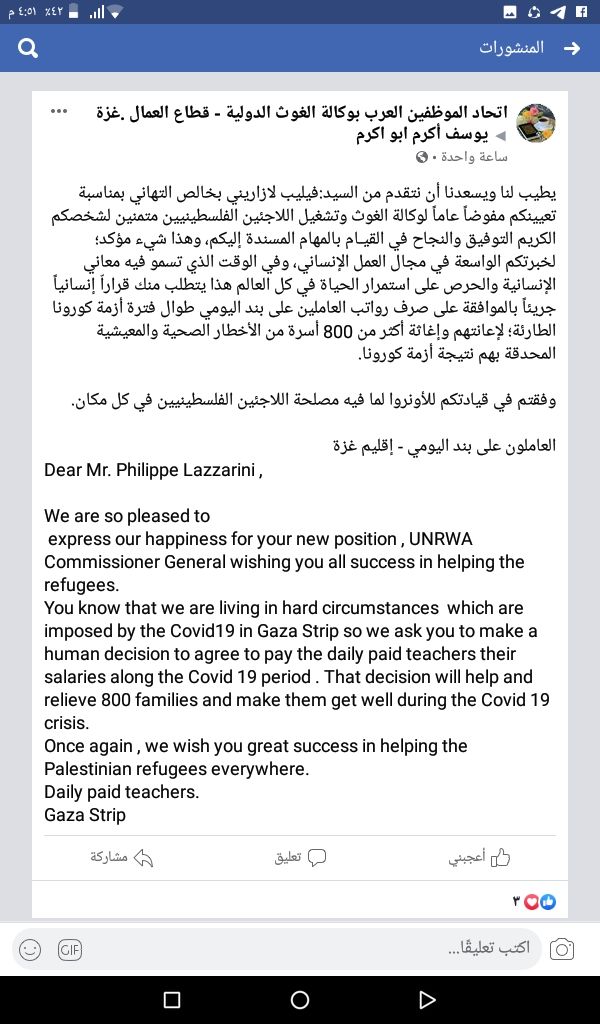 يطيب لنا ويسعدنا أن نتقدم إلى السيد/ فيليب لازاريني بخالص التهاني بمناسبة تعيينكم مفوضاً عاماً لوكالة الغوث وتشغيل اللاجئين الفلسطينيين متمنين لشخصكم الكريم التوفيق والنجاح في القيـام بالمهام المسندة إليكم، وهذا شيء مؤكد؛ لخبرتكم الواسعة في مجال العمل الإنساني، وفي الوقت الذي تسمو فيه معاني الإنسانية والحرص على استمرار الحياة في كل العالم، فإننا نتطلع من سيادتكم لقرار إنساني بالموافقة على صرف رواتب العاملين على بند اليومي طوال فترة أزمة كورونا الطارئة؛ لإعانتهم وإغاثة أكثر من 800 أسرة من الأخطار الصحية والمعيشية المحدقة بهم نتيجة أزمة كورونا.