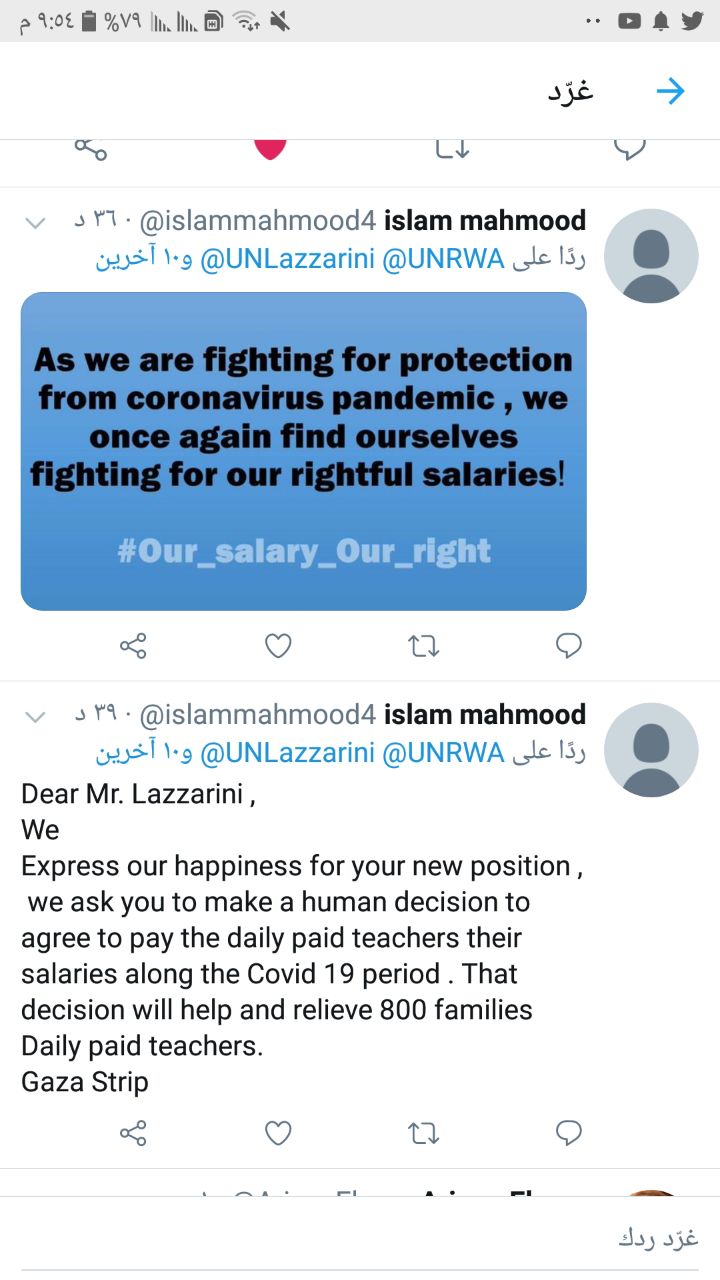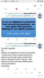 يطيب لنا ويسعدنا أن نتقدم إلى السيد/ فليب لازاريني بخالص التهاني بمناسبة تعيينكم مفوضاً عاماً لوكالة غوث وتشغيل اللاجئين الفلسطينيين الأونروا، متمنين لشخصكم الكريم التوفيق والنجاح في القيـام بالمهام المسندة إليكم، كما نتطلع من سيادتكم النظر في قضية صرف رواتب العاملين على بند اليومي في ظل أزمة كورونا، واتخاذ قرار إنساني باستمرار صرف رواتبنا لإعانة وإغاثة أكثر من 800 أسرة من الأخطار الصحية والمعيشية المترتبة على أزمة كورونا.