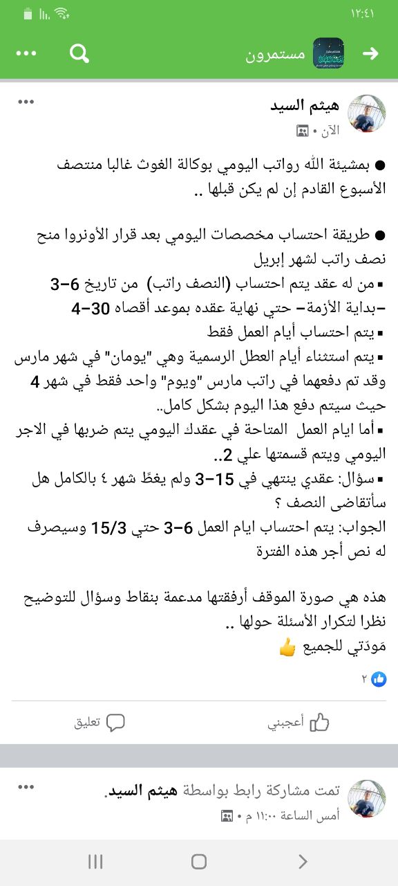 ▪︎يتم استثناء أيام العطل الرسمية وهي "يومان" في شهر مارس وقد تم دفعهما في راتب مارس "ويوم" واحد فقط في شهر 4 حيث سيتم دفع هذا اليوم بشكل كامل..