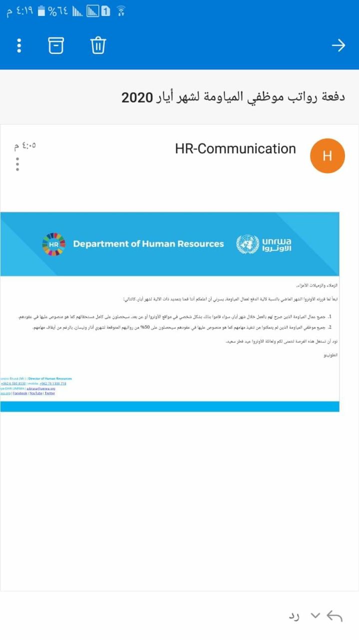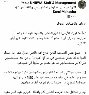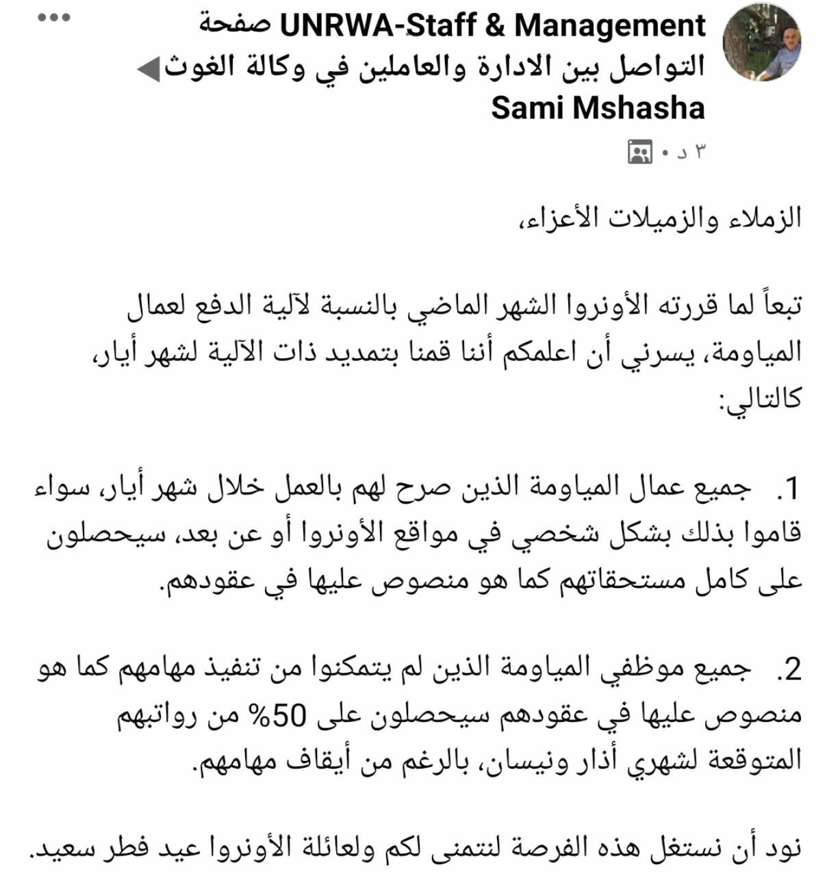 Dear Colleagues, As a follow-up to UNRWA’s decision of last month regarding the payment modalities for daily paid workers, I am pleased to announce that the Commissioner-General has decided to extend the same modalities for the month of May, namely that: