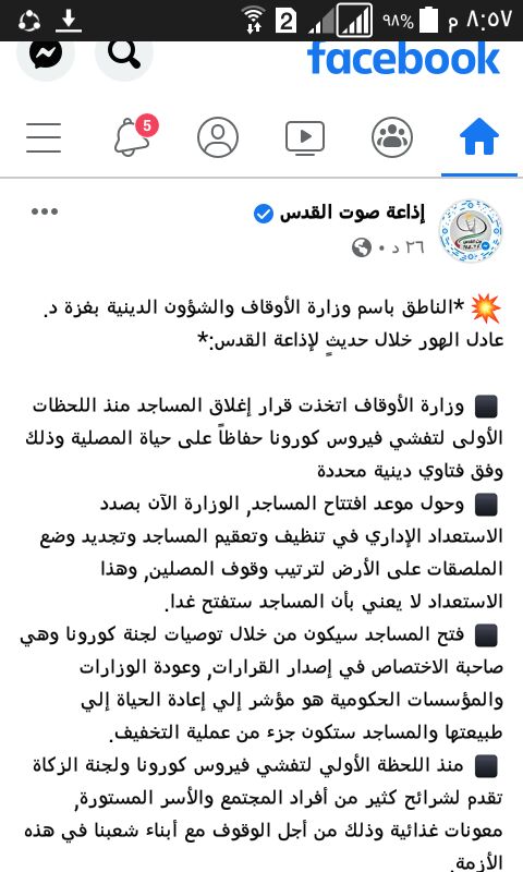 فتح المساجد مطلع الأسبوع القادم وفق إجراءات السلامة والوقاية في رفح وخانيونس والوسطى. -