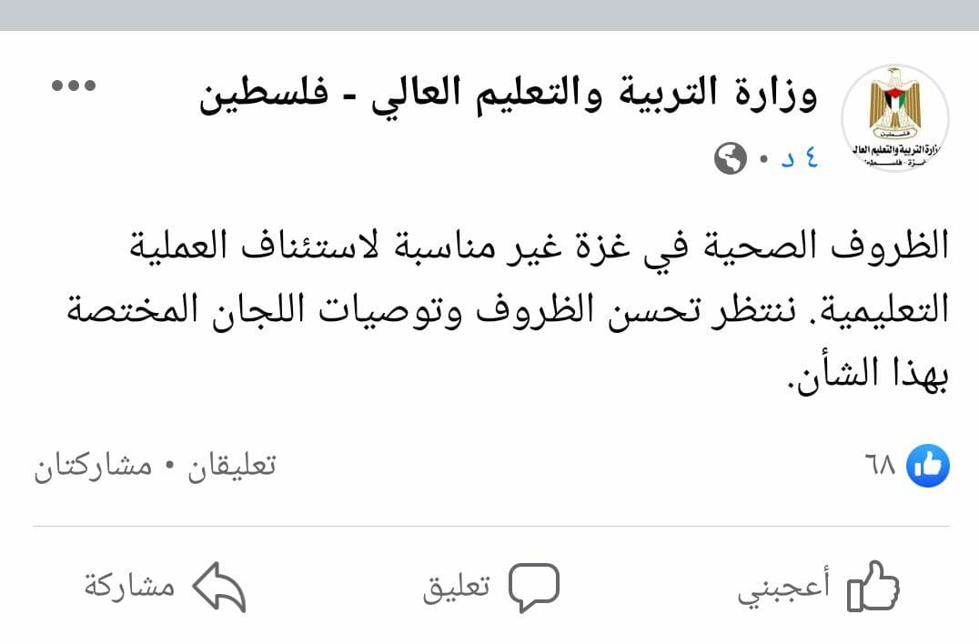 أما تعليم غزة يقول في أحدث تصريحات لع: لم يبدأ العام الدراسي بعد وما يجري هو تواصل الوزارة مع المعلمين والطلبة ولا نريد لوقت الفراغ أن يكون سيف مسلط على رقابنا ويذهب دون استفادة وأن العودة الآمنة للمدارس وفق الخطة المعدة سابقا ضمن السيناريو رقم (2) سيكون ثلاثة أيام دوام في الاسبوع بواقع لا يزيد عن 20 طالب في الفصل الواحد.