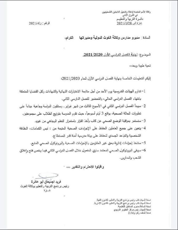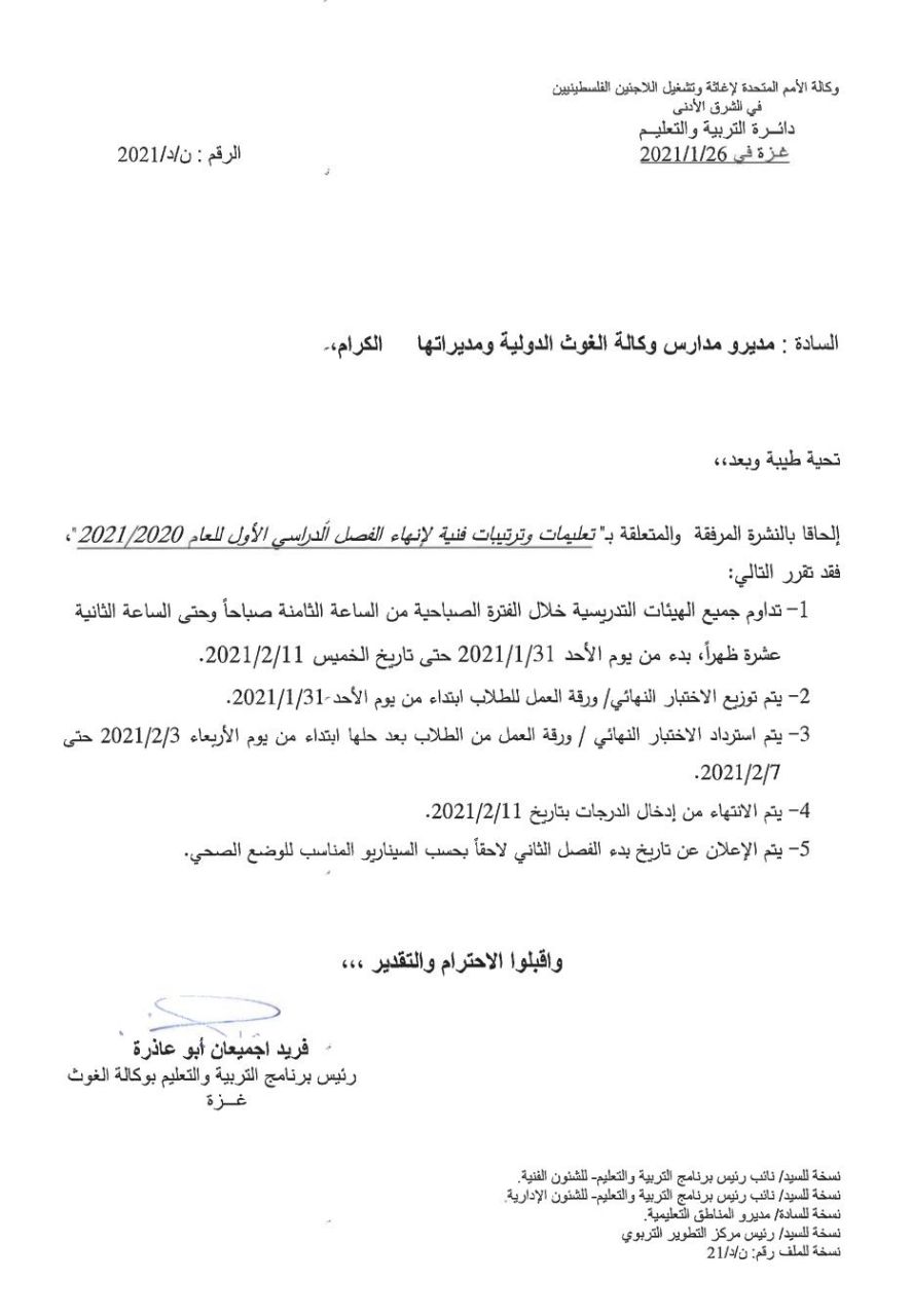 - سيداوم المعلومون اعتبارا من 31/1/2021 لمدة أسبوعين ما لم تتغير الظروف.