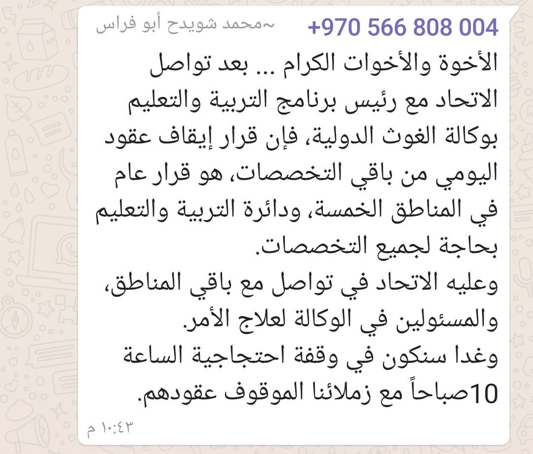 الأخوة والأخوات الكرام ... بعد تواصل اتحاد الموظفين العرب بوكالة الغوث الدولية بغزة مع رئيس برنامج التربية والتعليم بوكالة الغوث الدولية، تبين أن قرار إيقاف عقود اليومي من باقي التخصصات، هو قرار عام في المناطق الخمسة، ودائرة التربية والتعليم بحاجة لجميع التخصصات.