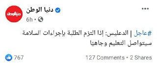 من اول ما بدأت الدراسة زادت الأخبار حول كورونا ، وبالنهاية المتضرر الوحيد هم أطفالنا ، الموضوع غير مقنع ارتفاع أعداد ثم اغلاق المدارس ، يجب أن نطالب ببقاء العام الدراسي وجاهيا مع تغيير برنامج الحضور اليومي وعدد الطلبة في الفصول .