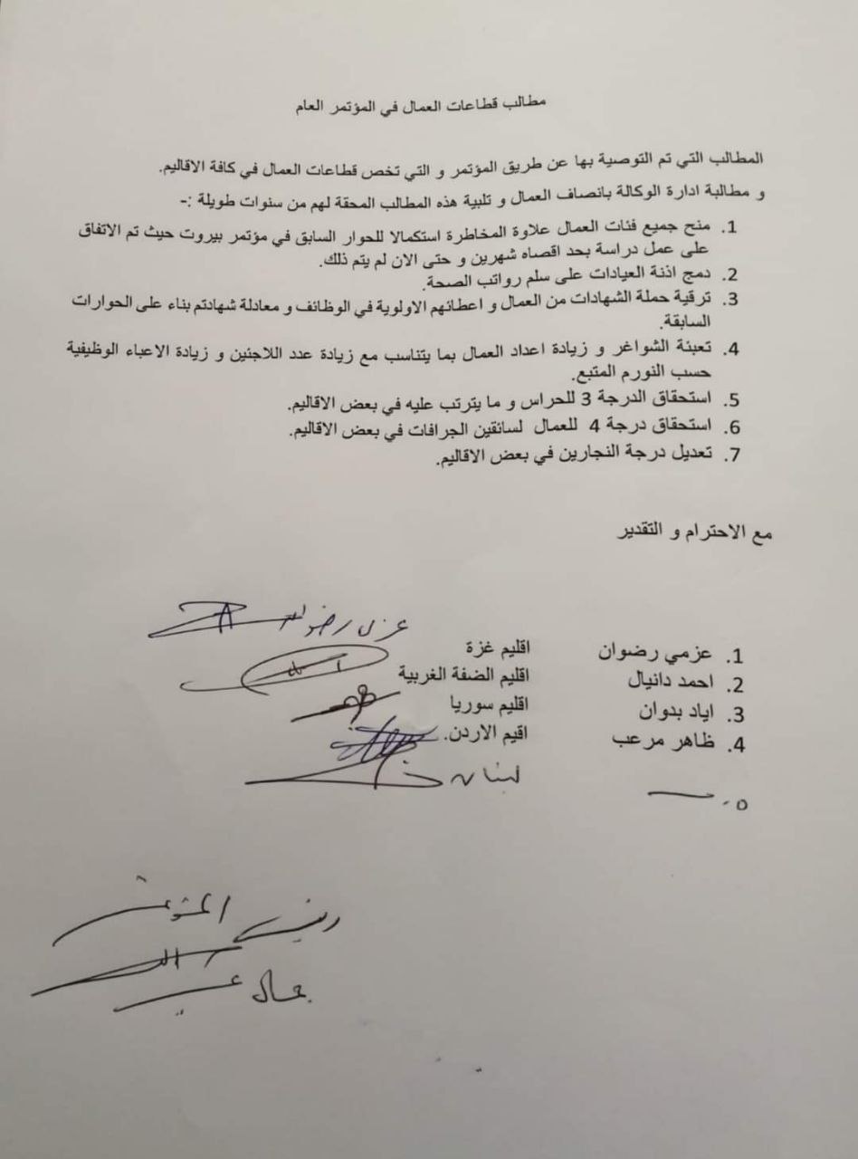 ▪️فوجئنا بالأمس وبعد انتهاء اليوم الأول التحضيري للمؤتمر ، وبعد مغادرة رئيس اتحاد الضفة الغربية ورئيس اتحاد إقليم الأردن وغياب اتحاد إقليم لبنان بإرسال رسالة الساعة السابعة مساء إلى إدارة الوكالة من قبل عدد من أعضاء من المؤتمر وعددهم 7 بينما عدد مجموع المشاركين كأعضاء المؤتمر 19 ، بتعيين رئيس جديد للمؤتمر بعد حصولهم على تزكية الإدارة ومن ثم الاستقواء. فوافقت الإدارة بعد عشر دقائق على ما تم إرساله