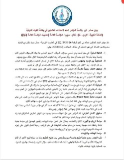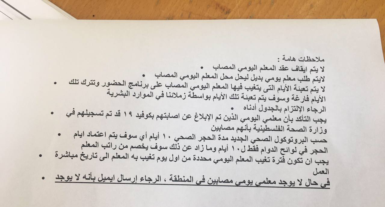 *إدارة الوكالة في إقليم لبنان تعمم تعليمات التطعيم على جميع الموظفين، والتي تشمل السماح لمن تلقى التطعيم بالعمل المباشر، وتطلب ممن لم يتلقاه فحصا أسبوعيا، على أن يكون الموظف غير المتطعم أو الذي لم يفحص أسبوعيا في إجازة بدون راتب إلى حين تلقي التطعيم أو تقديم الفحص الأسبوعي* -