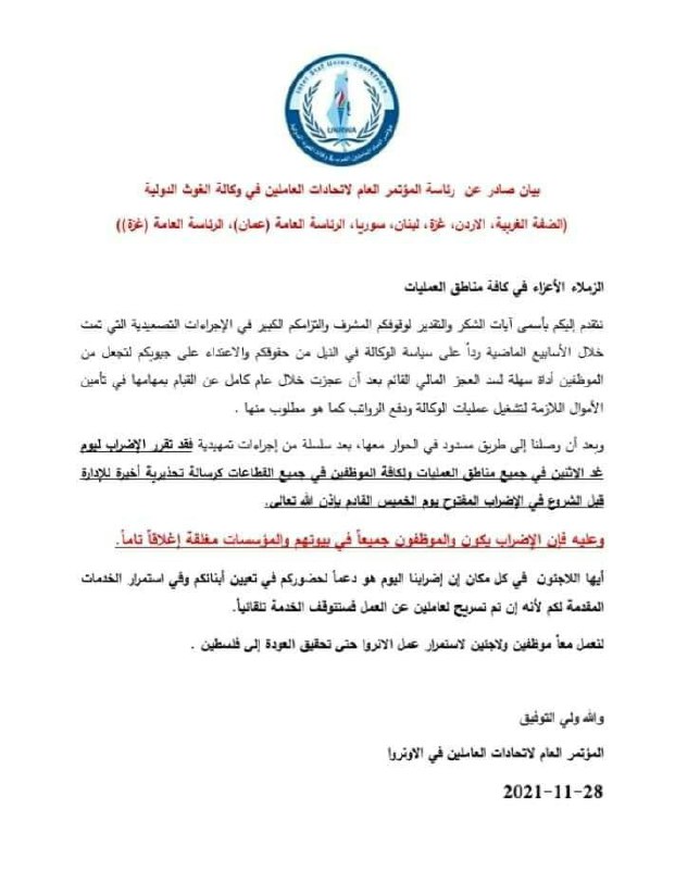 سيتم إلغاء فعاليات المؤتمر العام لاتحادات الاونروا بما فيها إضراب غدا، نظرا للتوافق ع كافة النقاط الخلافية