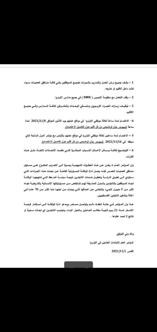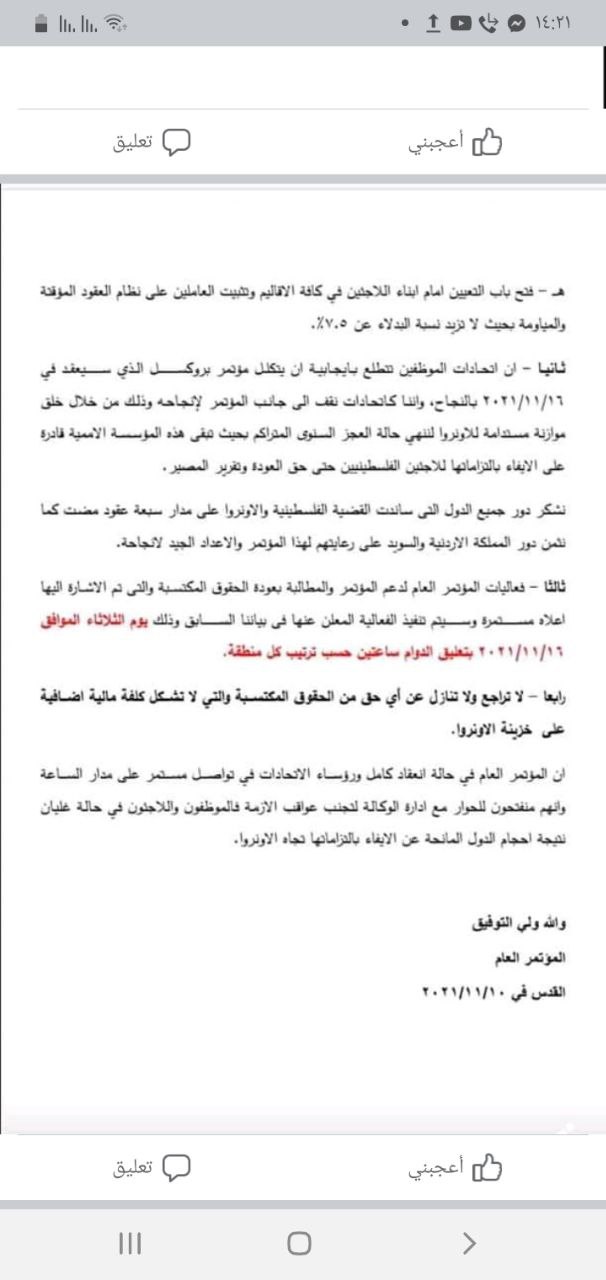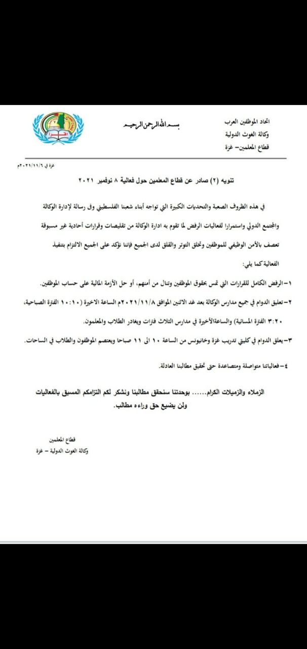 تدعوكم لجنة المتابعة للقوى الوطنية والإسلامية واللجنة المشتركة للاجئين للمشاركة وتغطية الفعالية الحاشدة التي ستقام يوم غد الأربعاء 10/11/2021، الساعة العاشرة صباحاً أمام البوابة الغربية للوكالة، تحـــت عنــــوان: