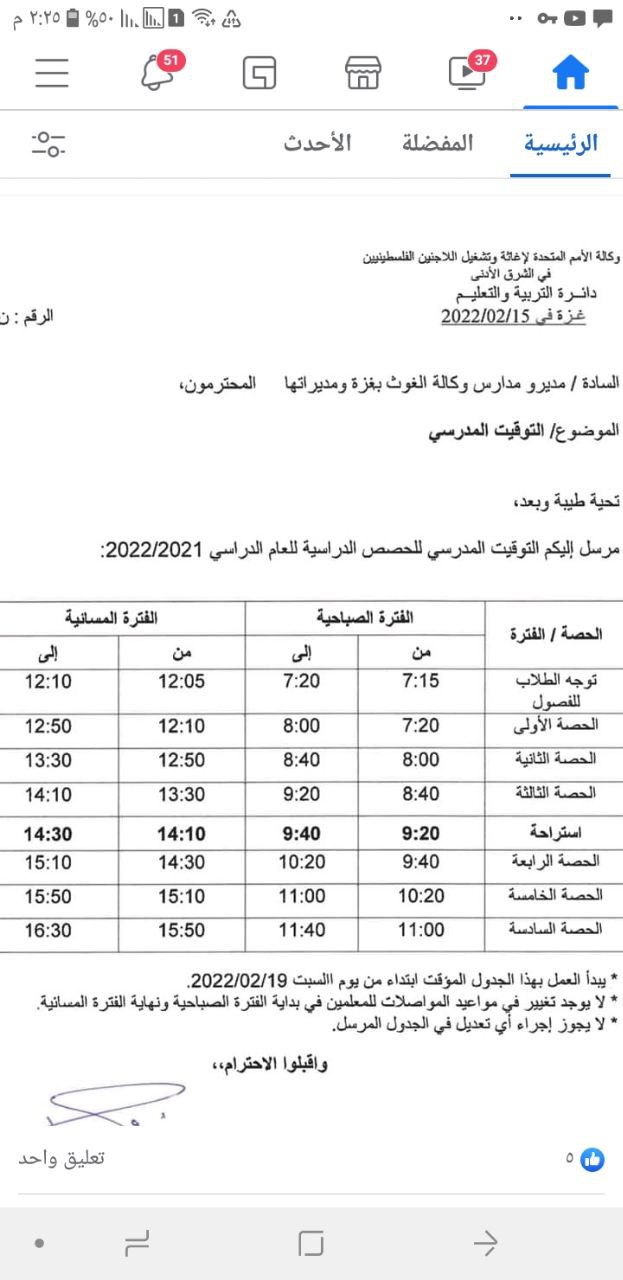 وزارة التربية والتعليم بغزة: "بدء من السبت 19/2/2022عودة الدوام المدرسي الصباحي القديم ل 7:15صباحا في كافة المدارس الحكومية والوكالة".