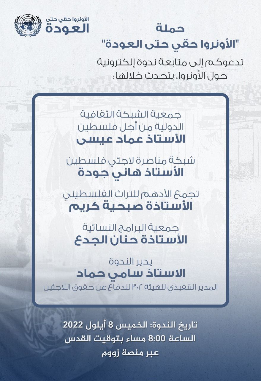ندعوكم لمتابعة الندوة الثانية من سلسة ندوات المتخصصة في قضايا الأونروا واللاجئين ضمن الحملة الدولية الأونروا حقي حتى العودة