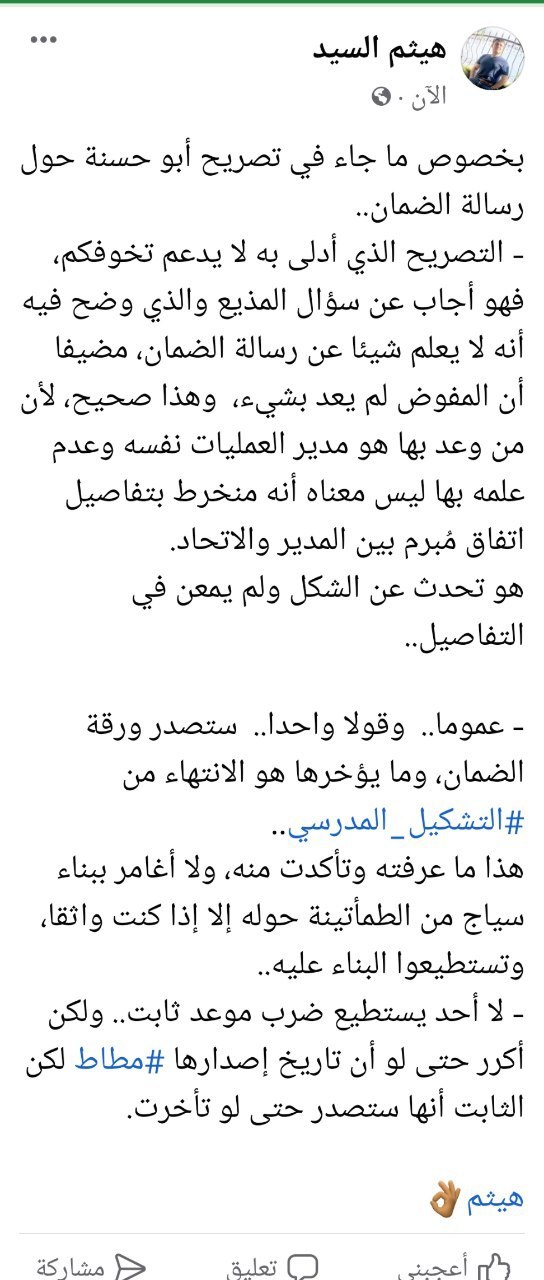 - ولكن بعد الضغوطات؛ لتحديد موعد ورقة الضمان، قالت الإدارة: ستتضح الأمور أواخر هذا الشهر بعد التشكيل المدرسي.