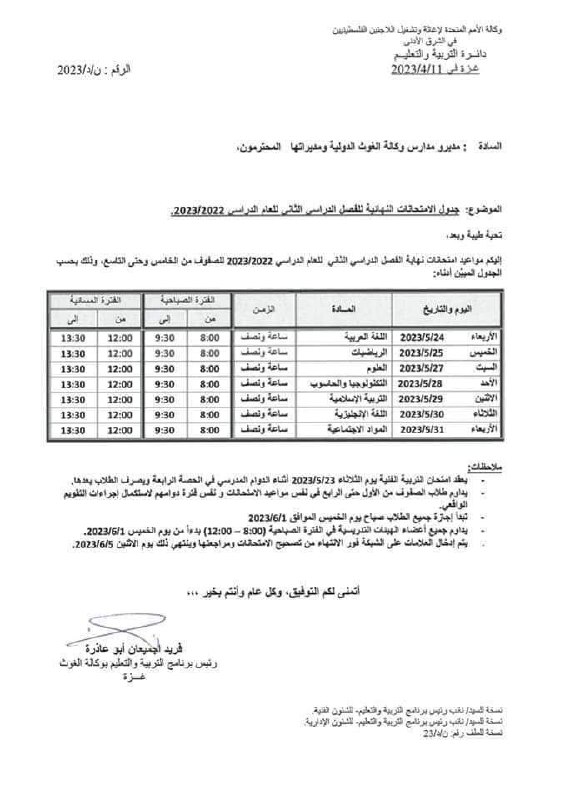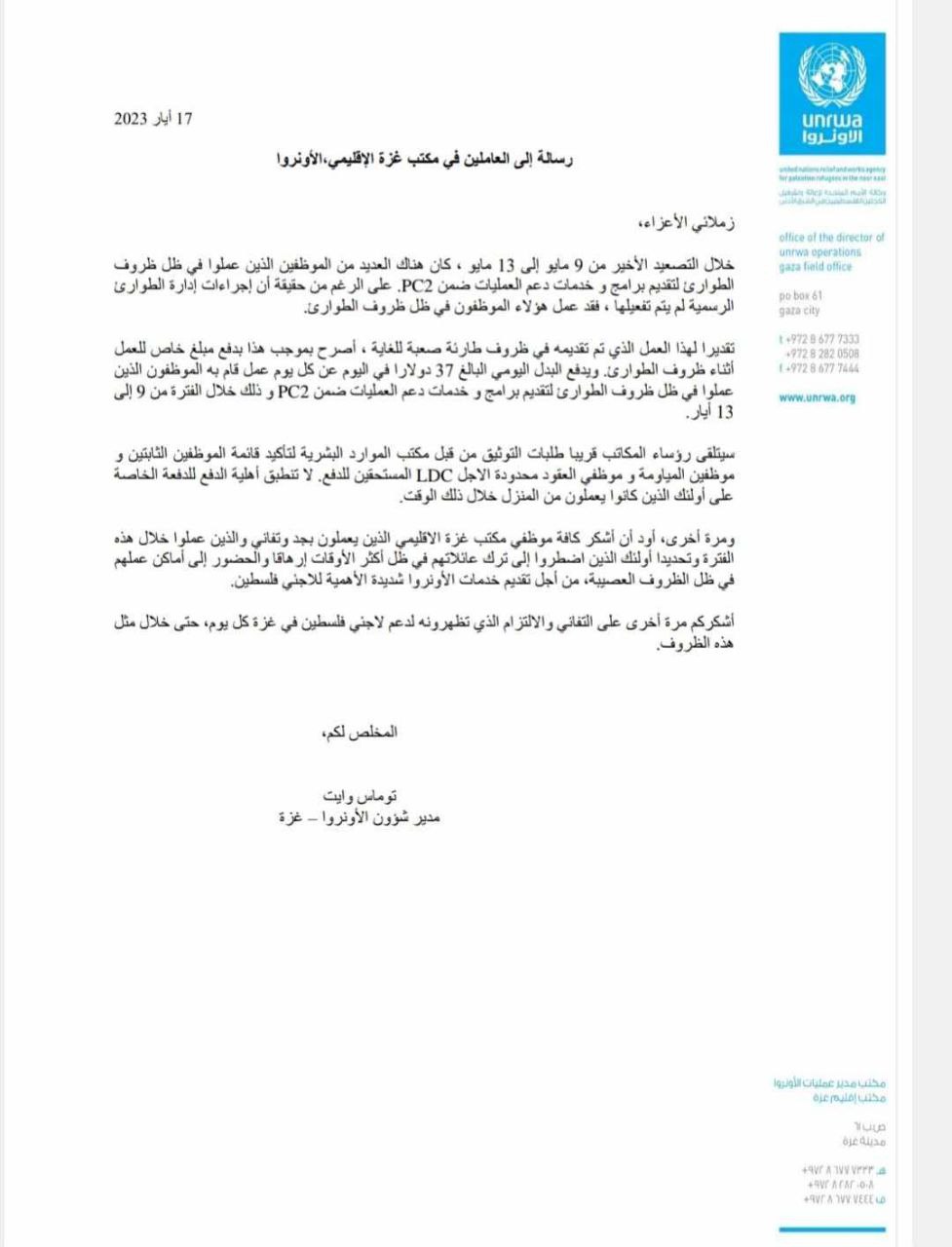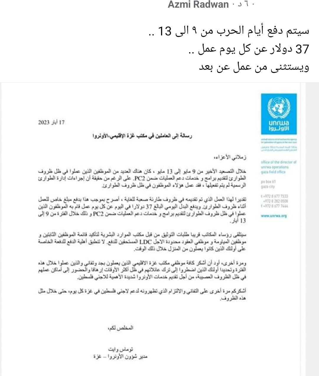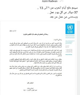 بخصوص الدفع والاستحقاقات المالية للعاملين في الاونروا خلال التصعيد الاخير. بغزة .