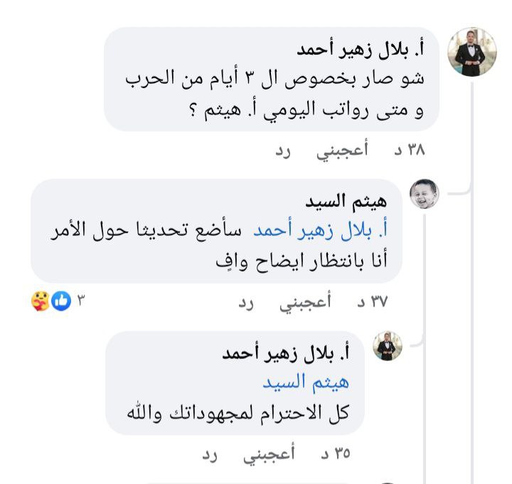 مش عارف ليش مستكثرينهم علينا أهل ضفه اضربوا ثلاثه شهور وصرفت رواتبهم كاملة بعد انتهاء الإضراب احنا ثلاثه ايام حرب مش راضين يصرفوهم